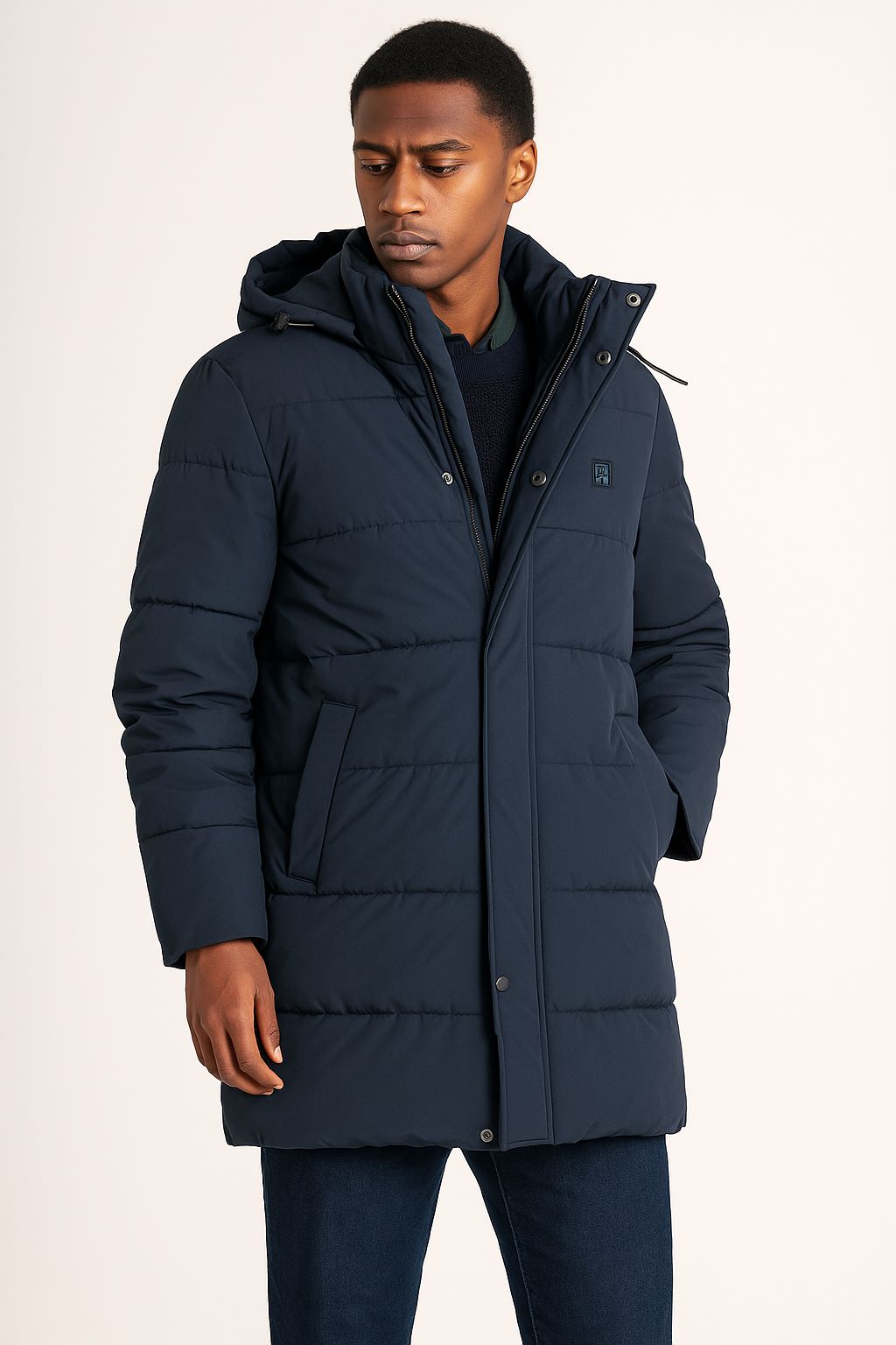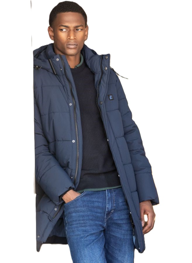 Bomber larga Gendive acolchada con capucha desmontable en color azul marino, diseñada para ofrecer abrigo, comodidad y estilo durante los meses más fríos. Fabricada en tejido acolchado de alta calidad, incorpora doble cierre con cremallera y botones a presión para una mayor protección térmica.