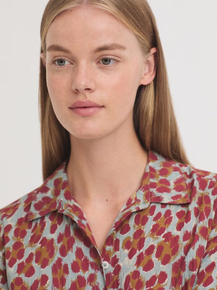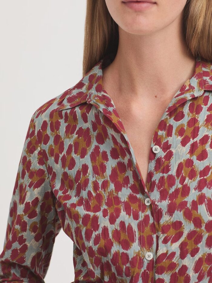 Camisa básica #99 con estampado Leopard, en tejido arrugado de algodón sostenible. Cuello camisero y botonadura de nácar. Manga larga con abertura, puño y botón. Presentada en bolsa del mismo tejido.