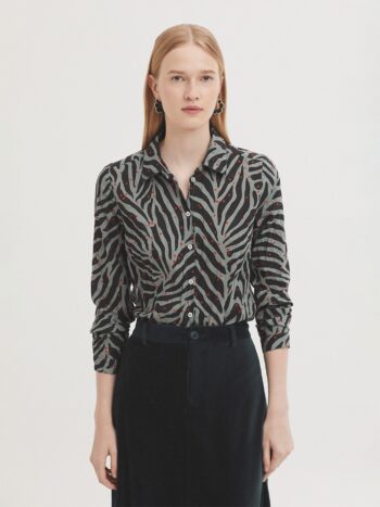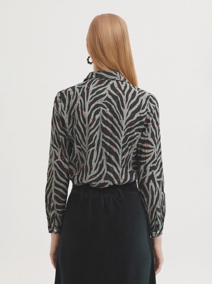 Camisa básica #99 con estampado Zebra, en tejido arrugado de algodón sostenible. Cuello camisero y botonadura de nácar. Manga larga con abertura, puño y botón. Presentada en bolsa del mismo tejido.