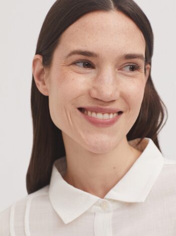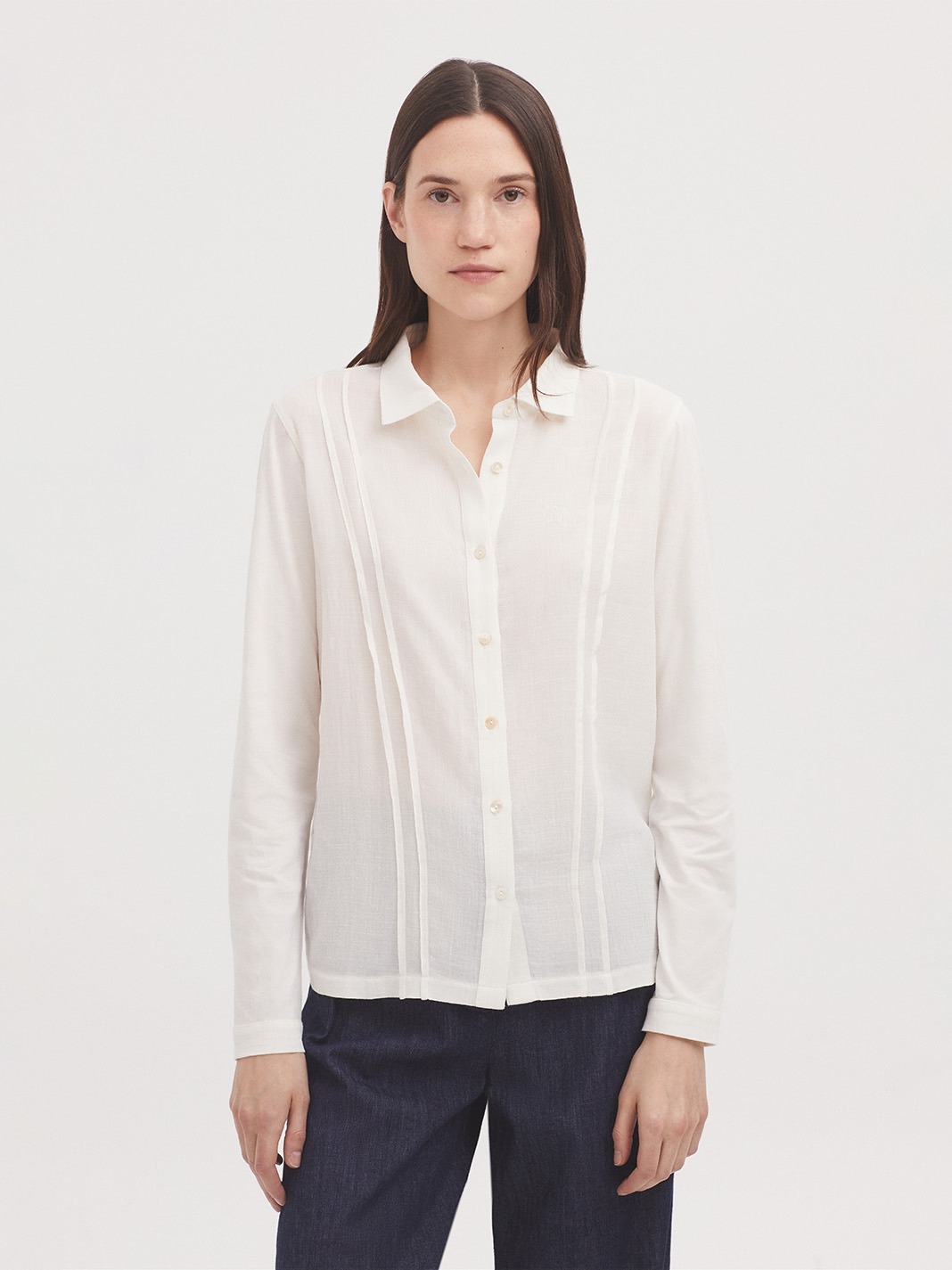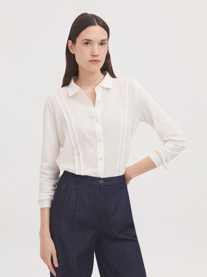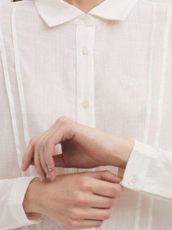 Camisa bimateria con algodón sostenible. Cuello camisero, abertura central con botones, manga larga y detalle de bordado NT en el delantero.
