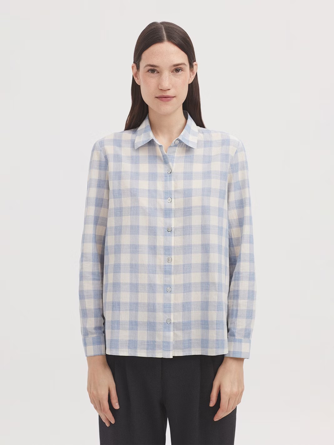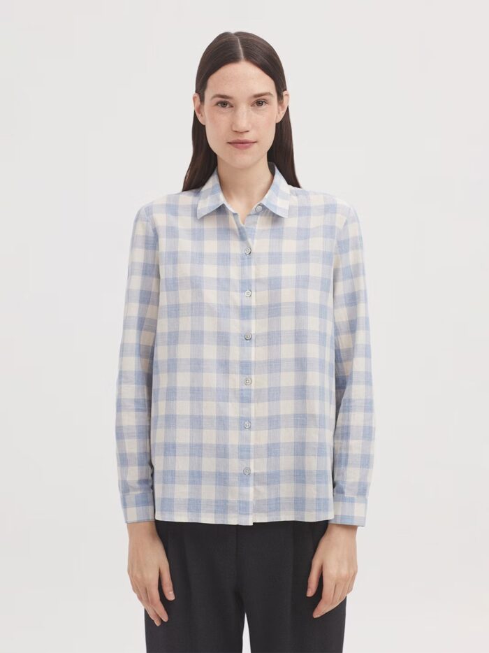 Camisa en tejido de cuadros de líneas, de algodón sostenible. Cuello camisero y botonadura frontal. Canesú y pliegue en la parte trasera. Manga larga con abertura, puño y botón.