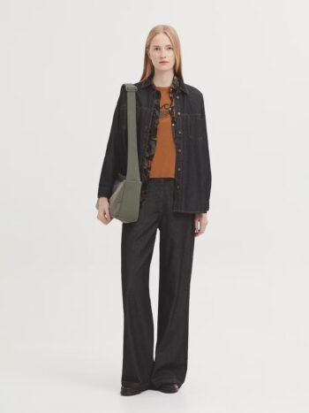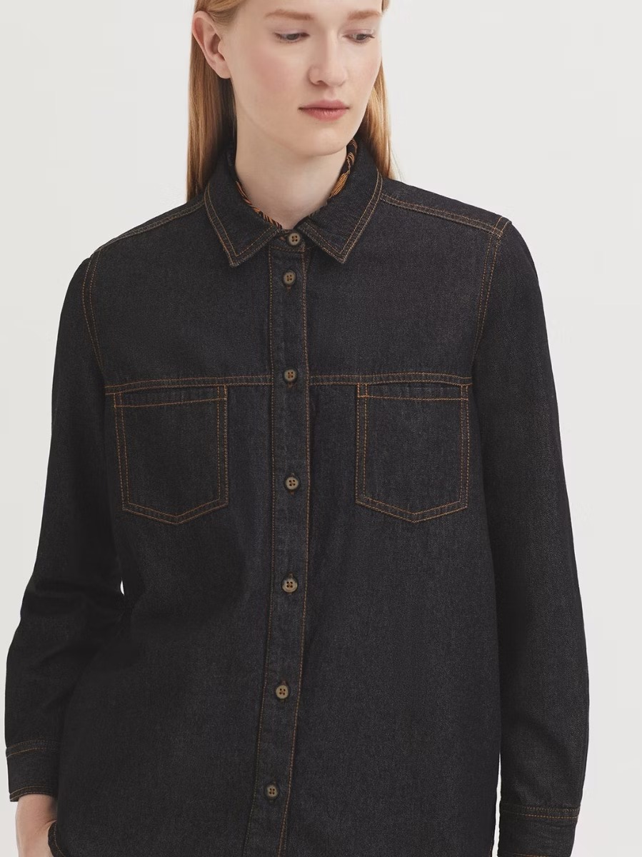 Camisa tejana gris de algodón sostenible, con cuello camisero, canesú delantero y bolsillos en el pecho. Canesú en la parte trasera. Manga larga con abertura, puño y botón.