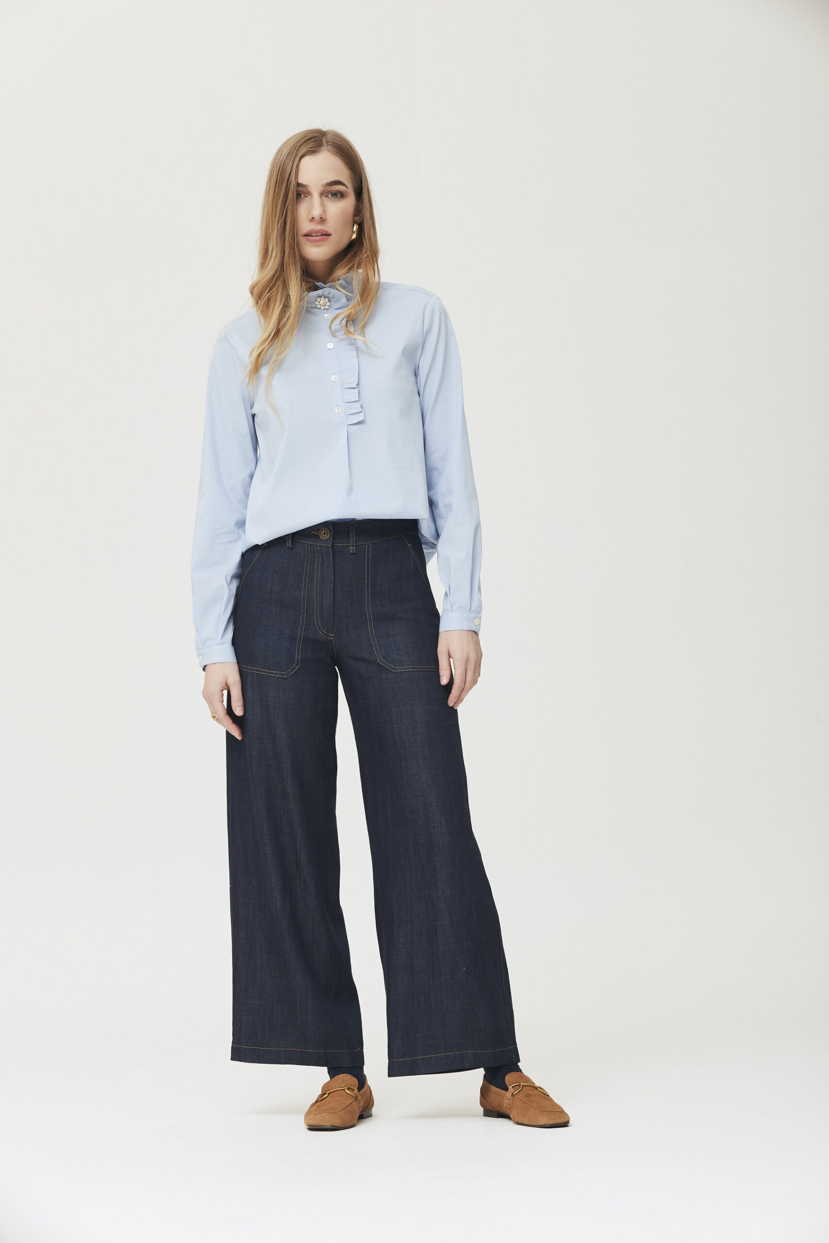 Camisa Manga Larga Con Cuello Caja Alto Y Adorno De Volante En Cuello Y Escote