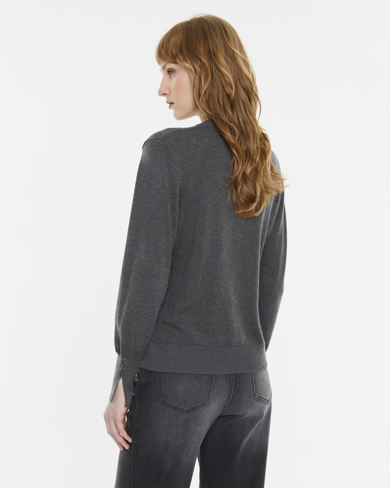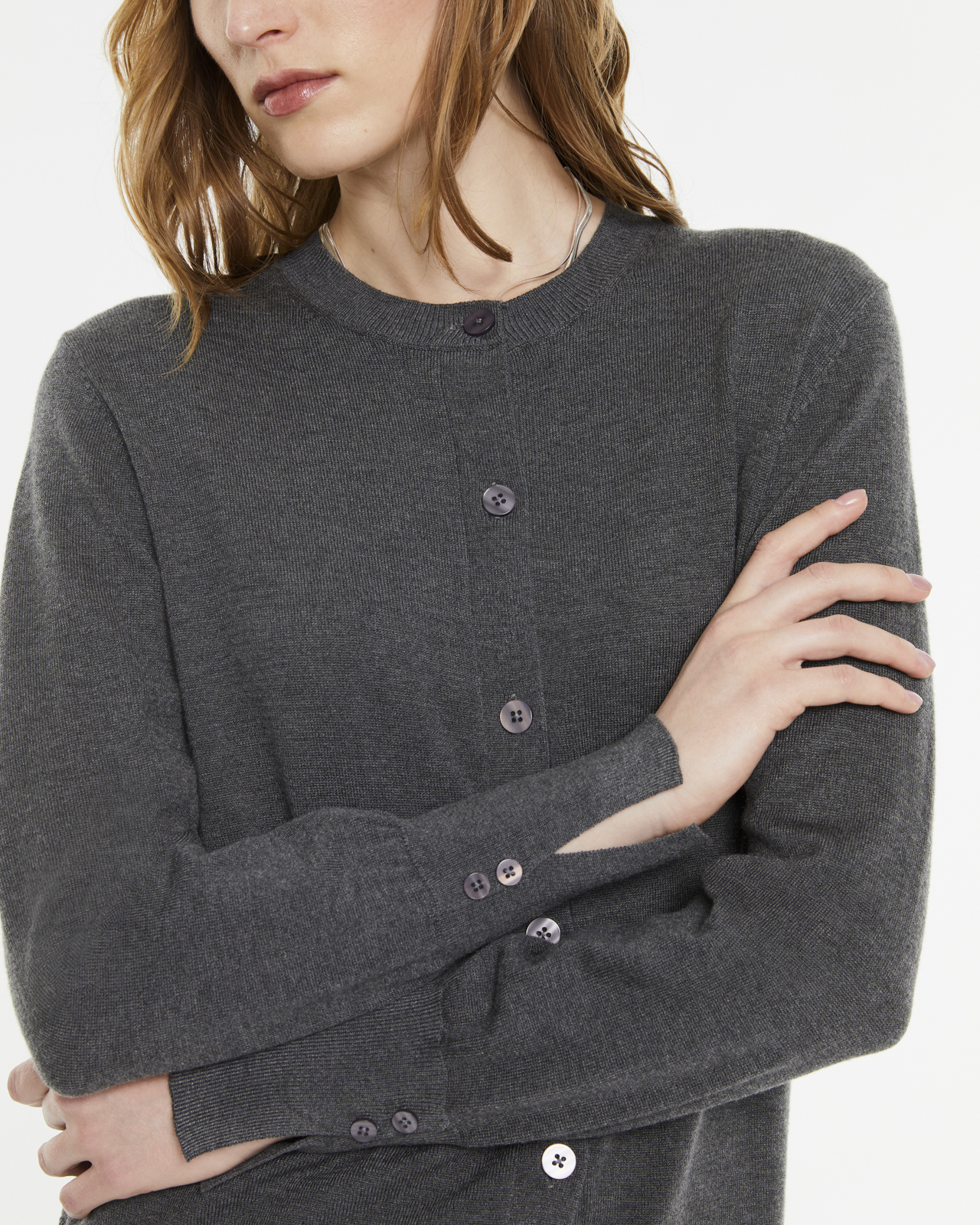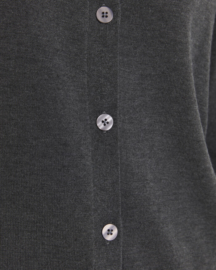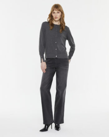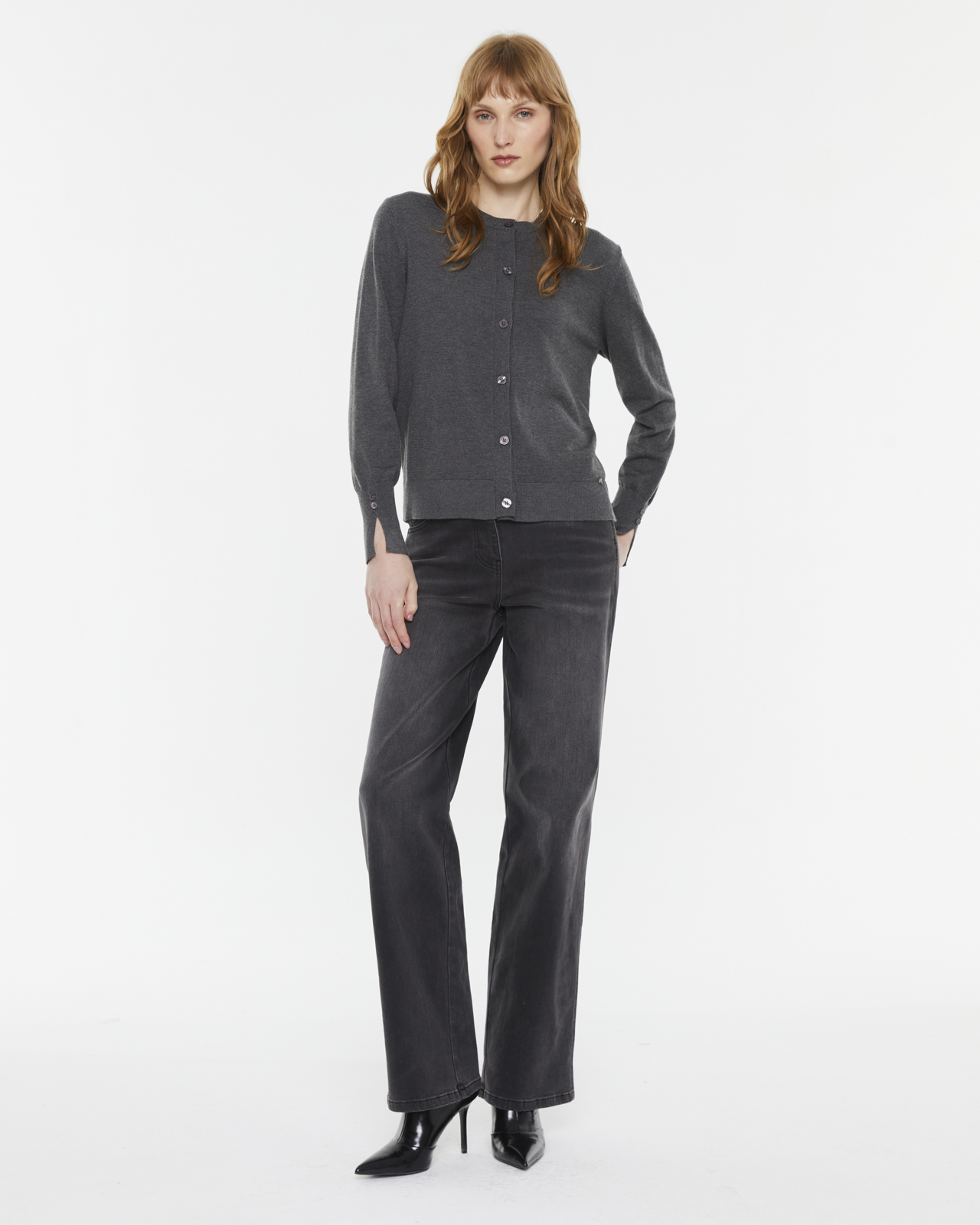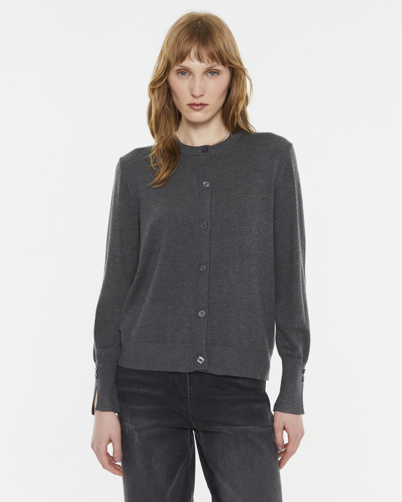 Cárdigan básico de cuello redondo y manga larga. Cierre frontal con botones y puños ligeramente fruncidos con aberturas y dos botones decorativos. Regular fit.