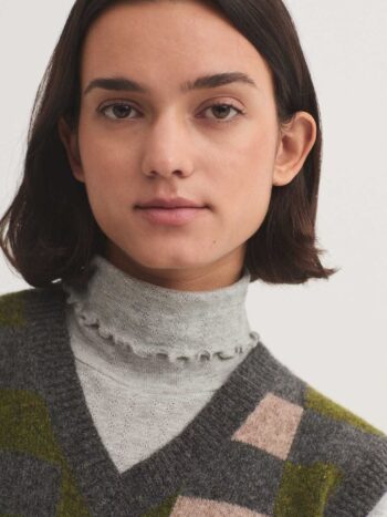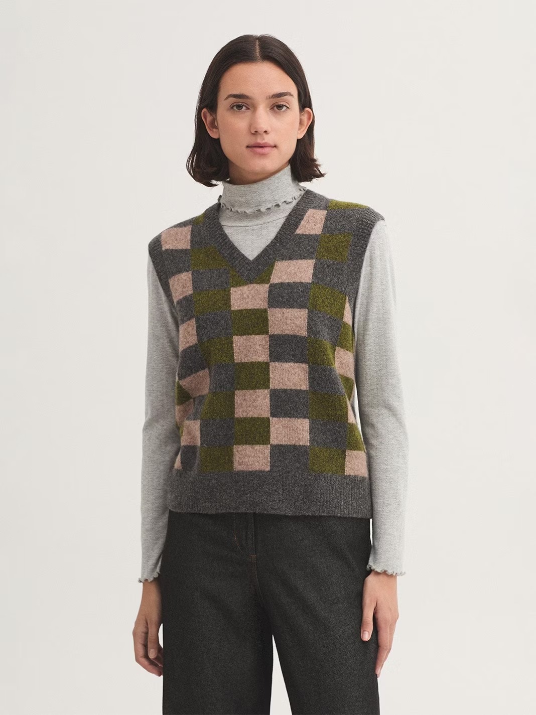 Chaleco de lana Lambswool con estampado de cuadros en la parte delantera, cuello pico y acabados en rib.