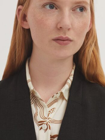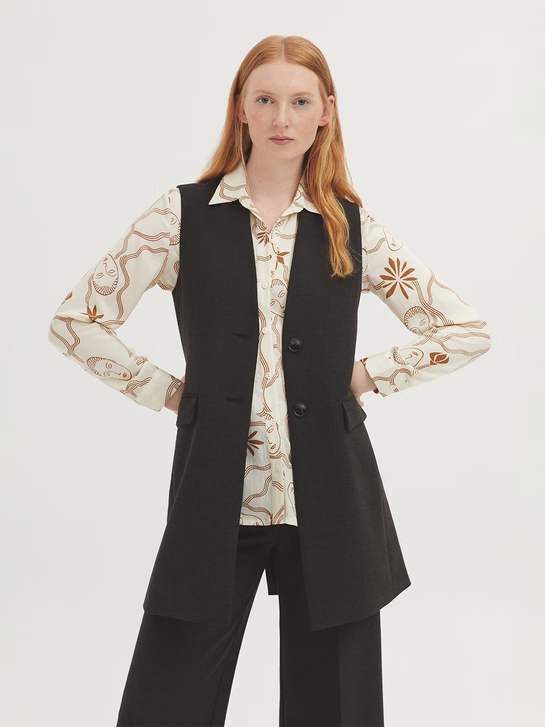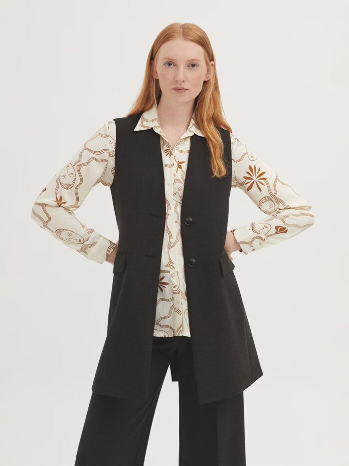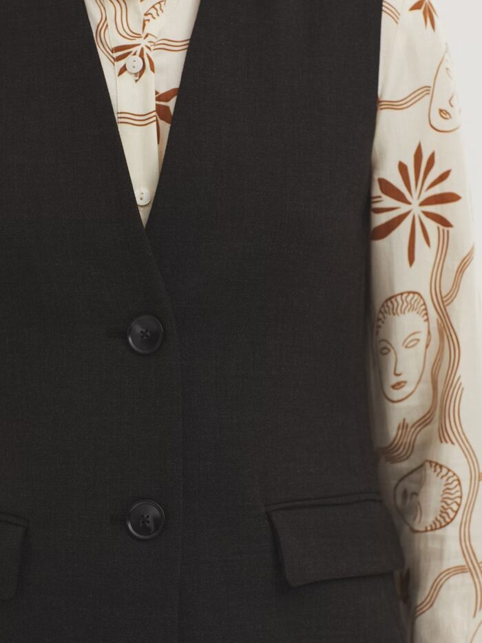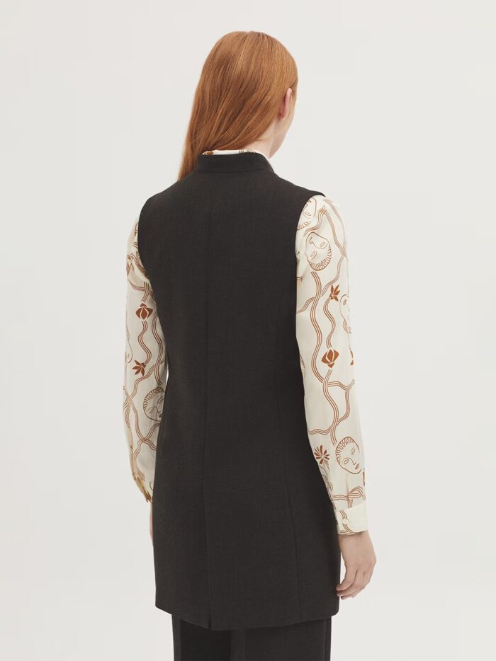 Chaleco en tejido melange. Cuello subido y botonadura frontal. Bolsillos con tapetas. Forrado. Abertura en la parte trasera.