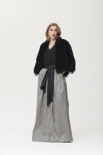 Chaqueta corta confeccionada en pelo sintético con efecto pluma en color negro, que crea una textura impactante y voluminosa. Su diseño incluye mangas 3/4 y corte recto, ofreciendo un look sofisticado y contemporáneo. Ligera y muy cómoda de llevar, esta prenda es ideal para ocasiones especiales o para transformar estilismos cotidianos en conjuntos glam y de tendencia. Fácil de combinar sobre vestidos, faldas o pantalones, aporta personalidad y abrigo con mucho estilo.