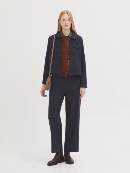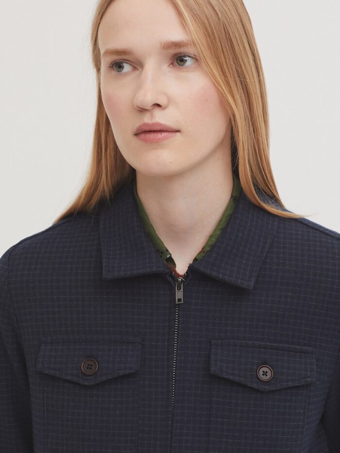Chaqueta en tejido Window Check con mezcla de poliéster reciclado. Cuello camisero y cierre frontal con cremallera. Bolsillos de vivo y bolsillo de parche con tapeta en el pecho. Canesú en la espalda