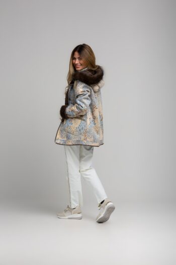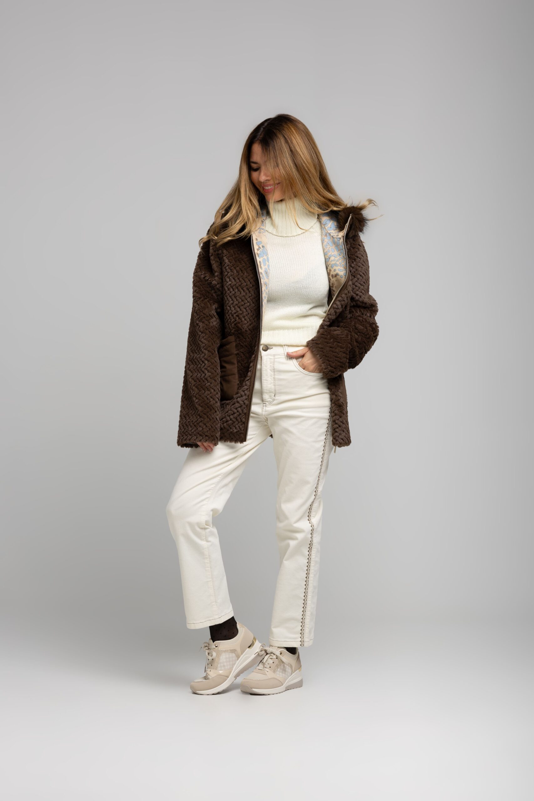 Por un lado presenta un elegante acabado de pelo en color marrón oscuro con cinta decorativa que aporta un aire sofisticado y cálido. Por el otro lado luce un atractivo estampado sobre fondo beige que da un toque más desenfadado y actual, ideal para looks de diario.