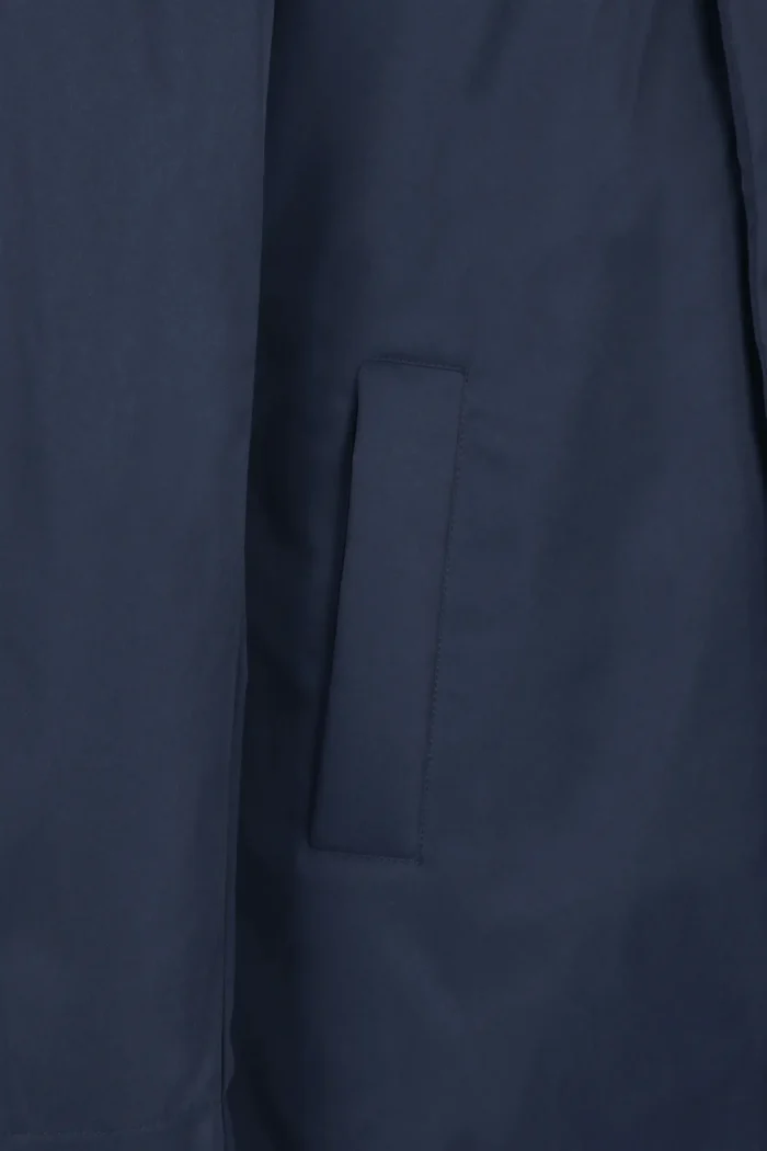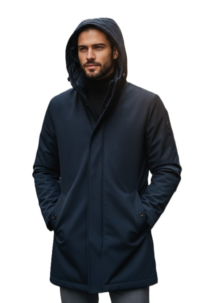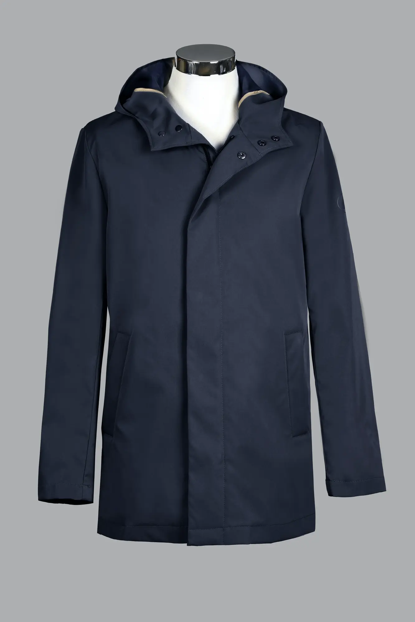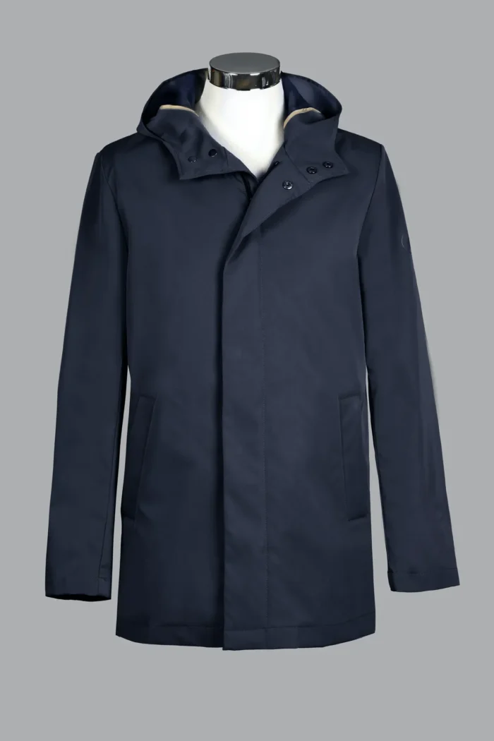 Gabardina impermeable azul marino. Una prenda esencial para el invierno. Esta gabardina impermeable azul marino combina funcionalidad y estilo con un diseño limpio y contemporáneo.