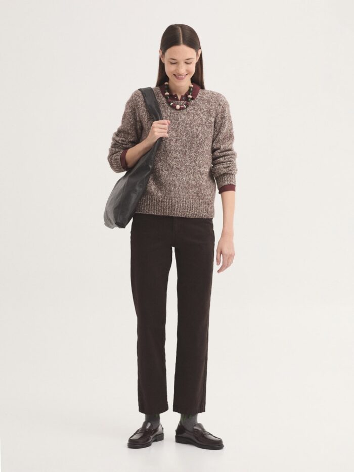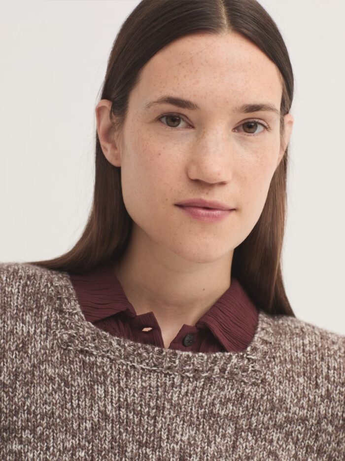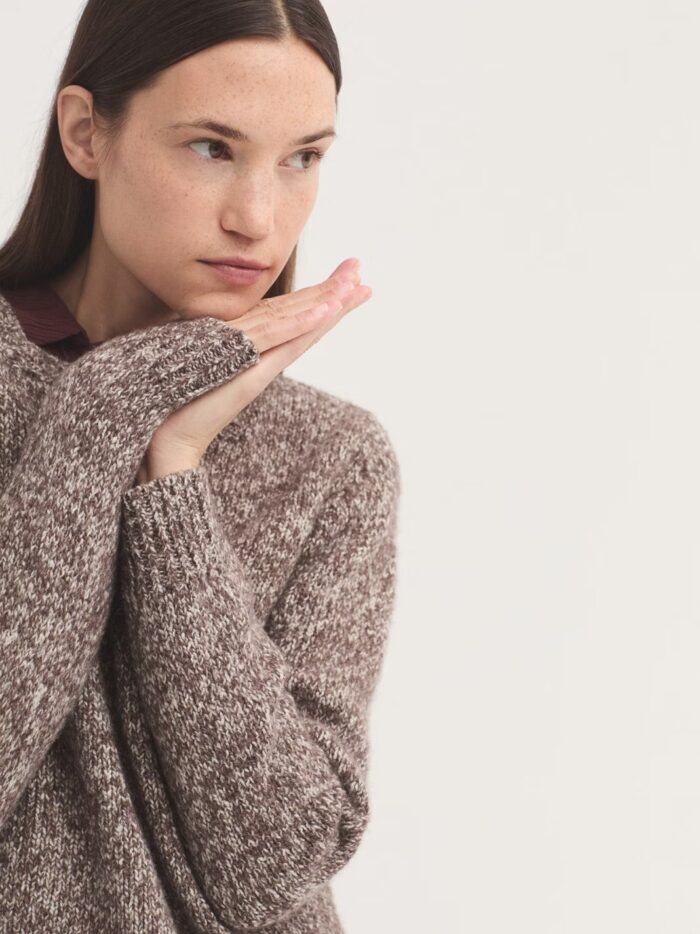 Jersey en mezcla de lana y algodón sostenible de hilo torzal. Detalle de cuello cuadrado, manga larga y acabados en rib.