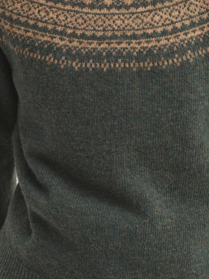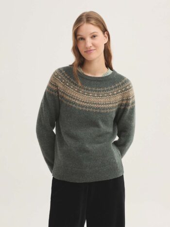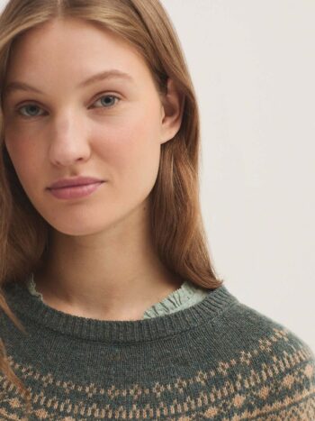 Jersey de lana con cuello redondo y detalle de greca en jacquard. Manga raglán y acabados en rib.