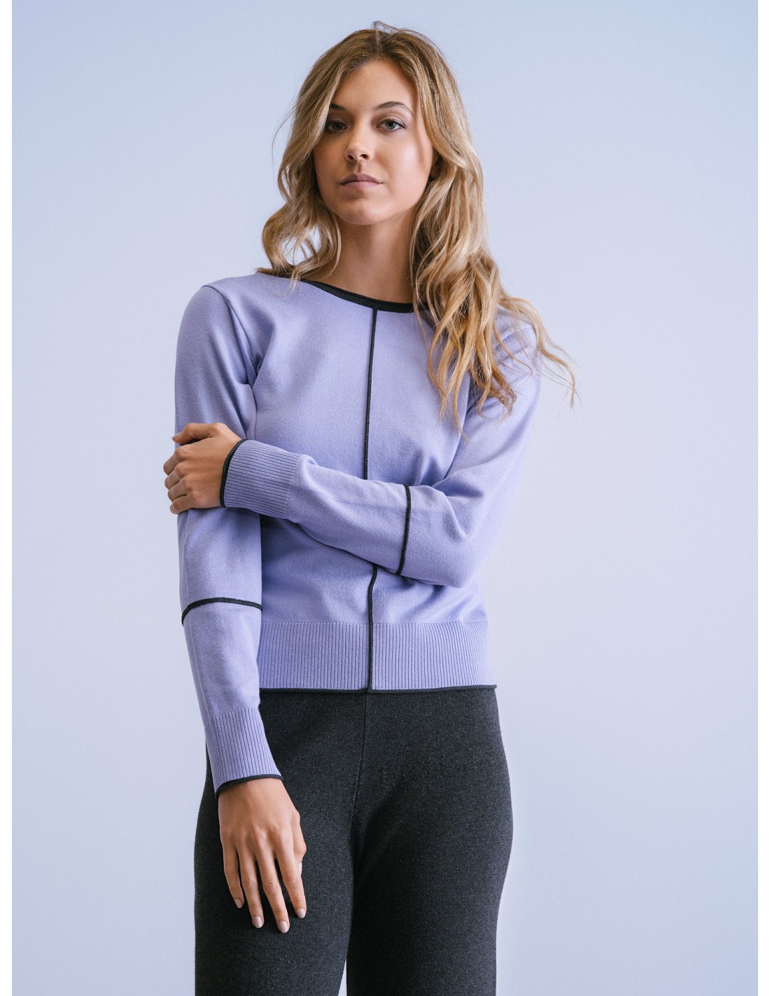 Jersey de punto suave con un diseño moderno y favorecedor. Su color claro se realza con líneas en contraste que recorren el frontal y las mangas, aportando un toque actual y estilizado.