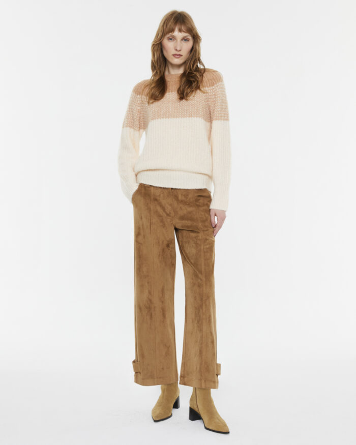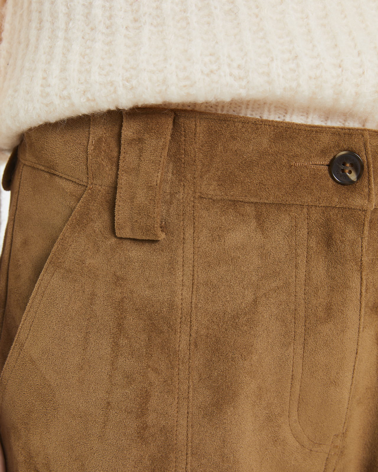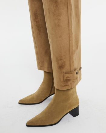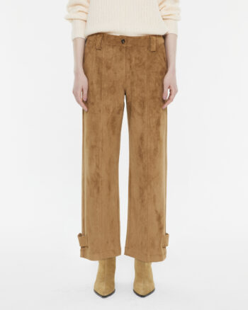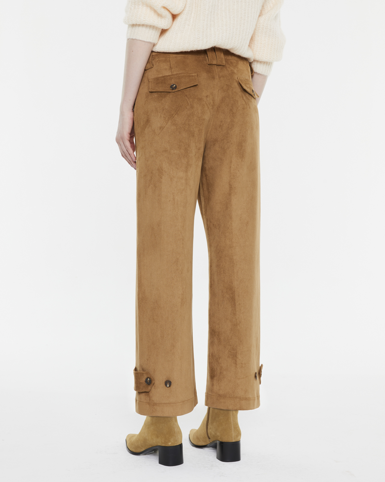 Pantalón de mujer ancho tobillero en antelina. Cierre con botón y cremallera, bolsillos laterales. Detalle en el bajo de tira con botón para poder ajustar el ancho del pantalón. Puedes encontrar su chaqueta a conjunto.