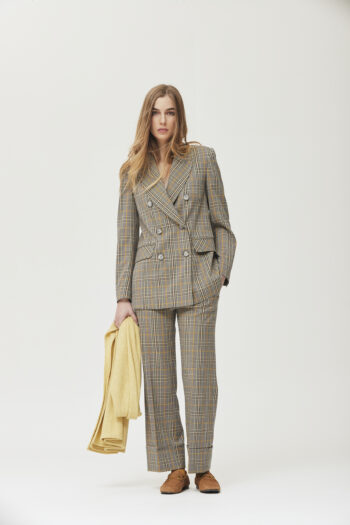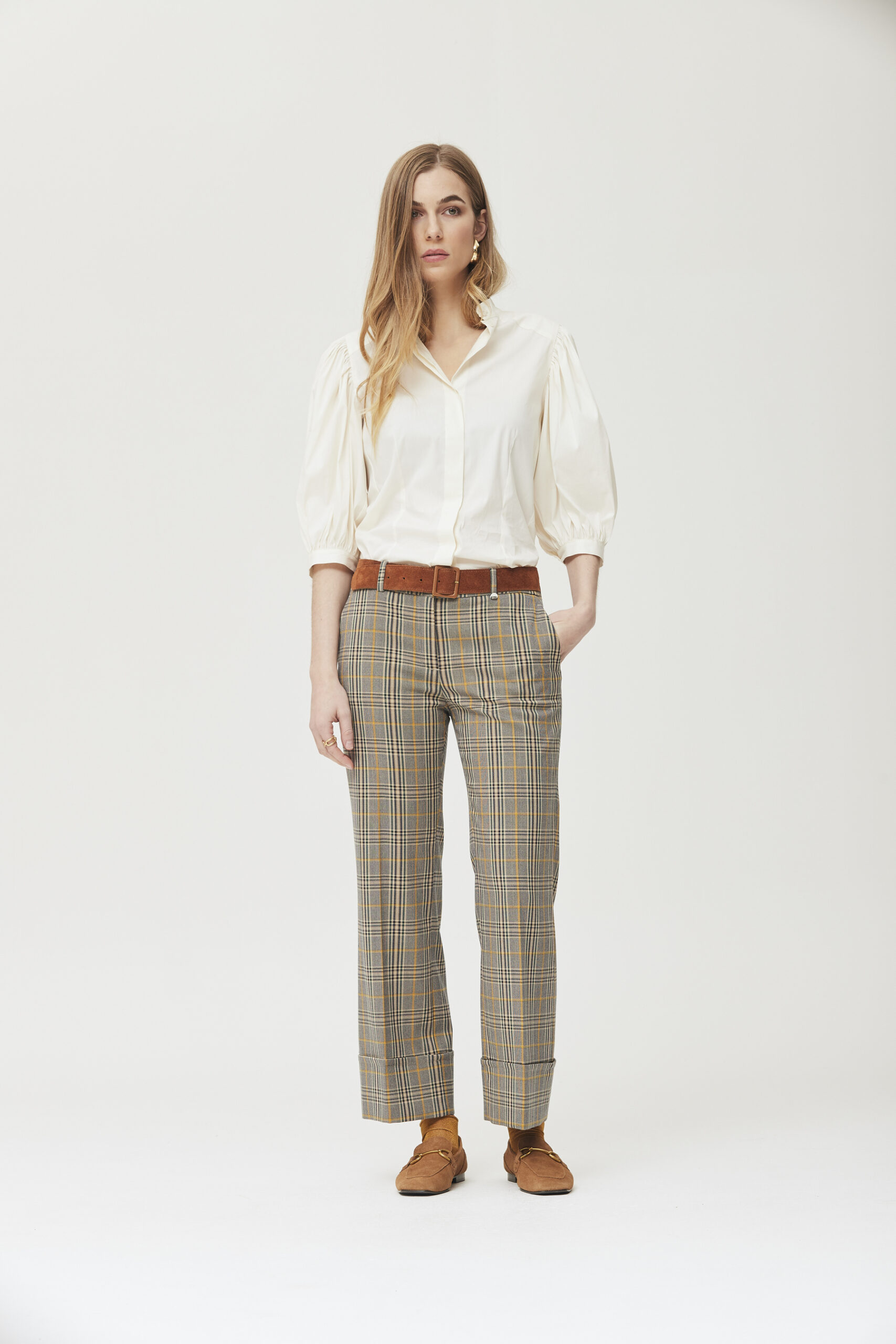 Pantalón recto, con ligera campans, vuelta ancha en el bajo. Lleva bolsillos latrrales y trabillas para cinturón.