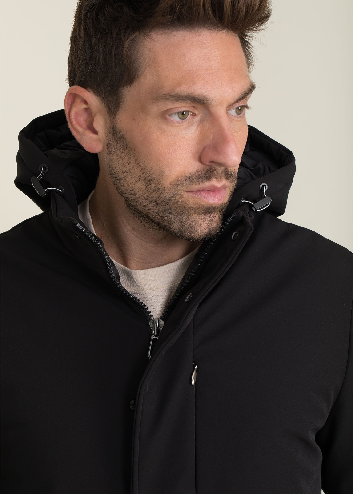 Parka larga SLIM FIT, resistente al agua y rellena de plumón para los días de frío intenso. Diseño moderno con capucha desmontable, cierre oculto y bolsillos termosellados. Funcionalidad y estilo en una sola prenda. Color negro