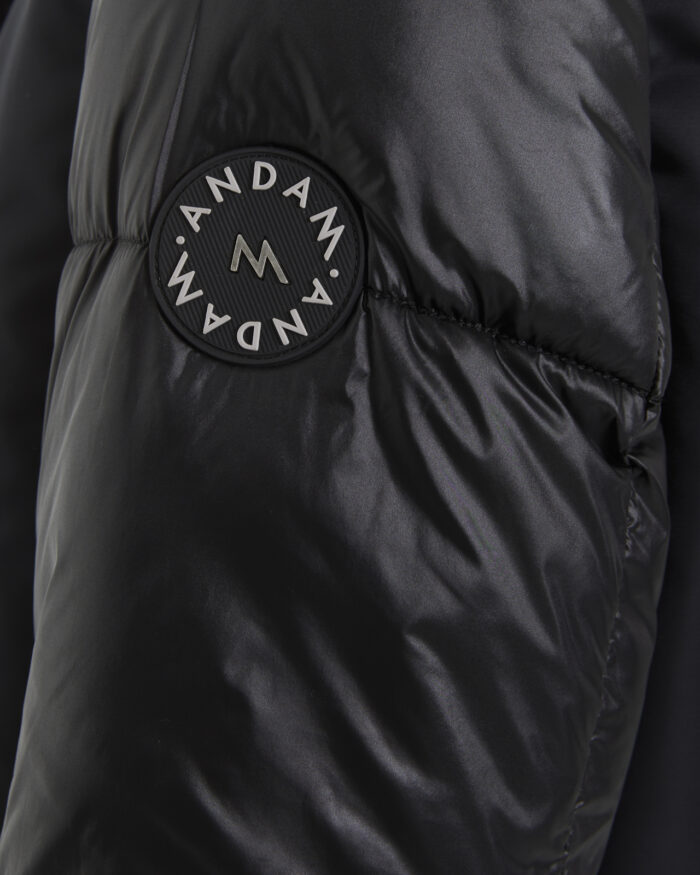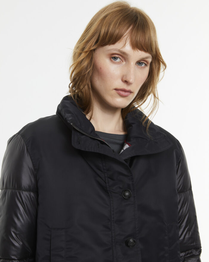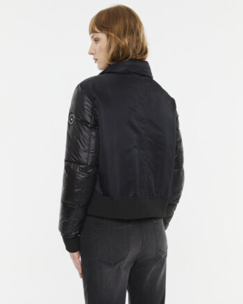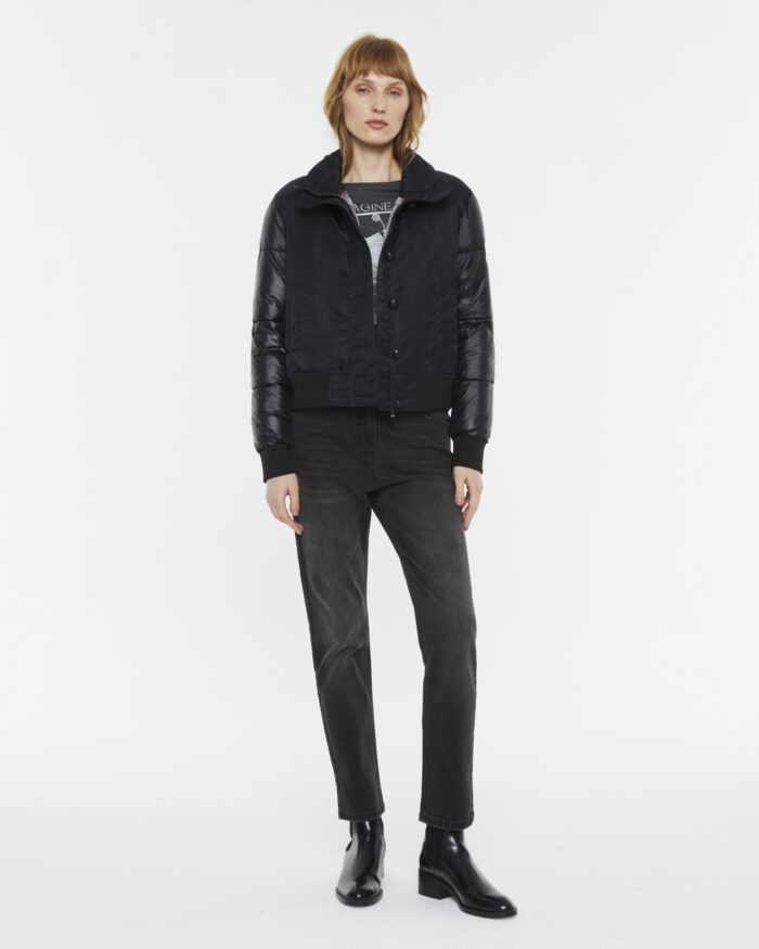 Chaqueta corta acolchada tipo bomber.Cuello alto y cierre con cremallera y botones metálicos tipo militar. Bolsillos tapeta. Puños de canalé elásticos. Etiqueta logo marca en manga y bajo. Regular fit.