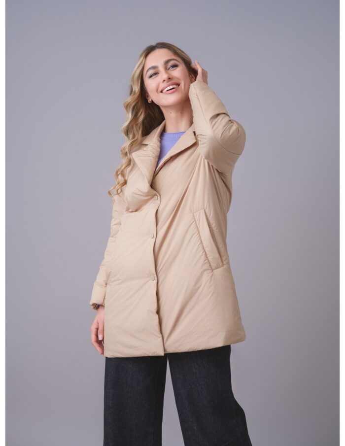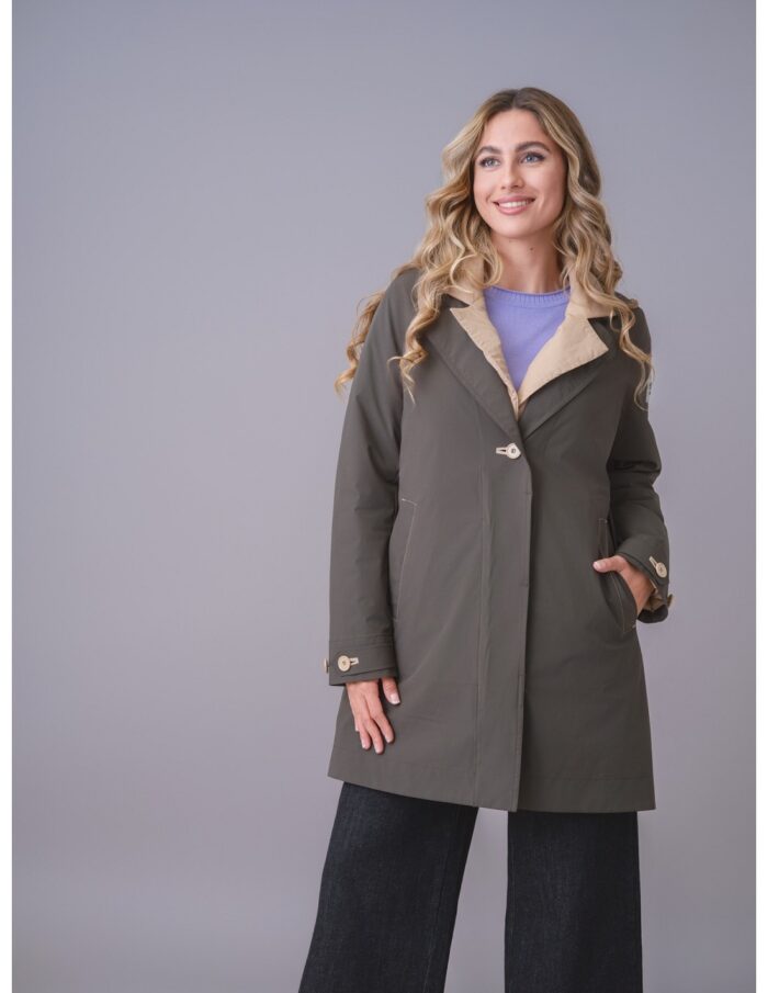 Abrigo con combinación de tejidos: parte exterior en poliéster fino color verde y parte interior en tejido ligeramente acolchado beige. Una prenda ligera, cómoda y perfecta para el entretiempo.