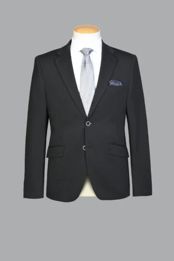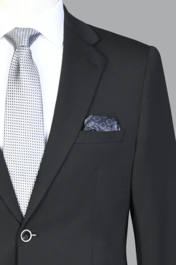 La chaqueta presenta solapa clásica, cierre de dos botones y bolsillos con solapa, además de un pañuelo decorativo que aporta distinción al conjunto. El pantalón, sin pinzas, ofrece una línea más limpia y moderna. Incluye un elástico oculto en la cintura que mejora el ajuste y la comodidad durante todo el día.