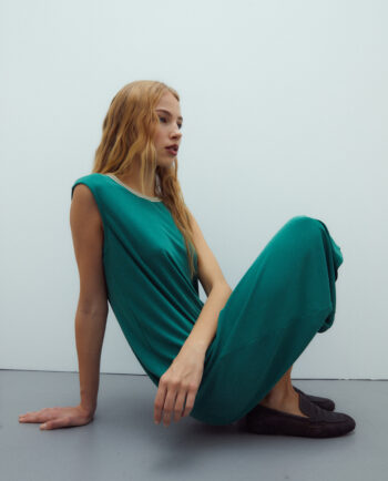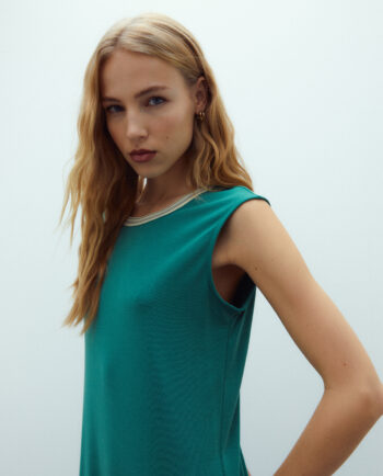 Este modelo presenta un diseño de cuello caja y sin mangas, ideal para los días más cálidos. Incorpora un detalle de tira canalé en el escote con rib a contraste y un sutil acabado en hilo metalizado cobre que aporta un toque distintivo y elegante.