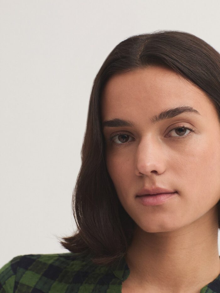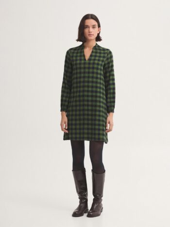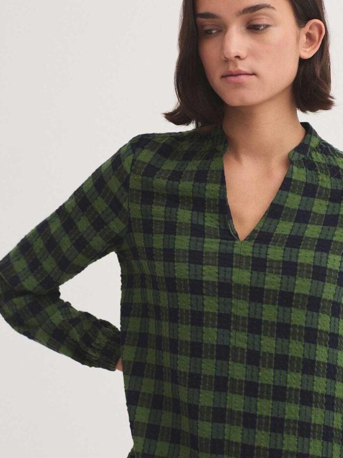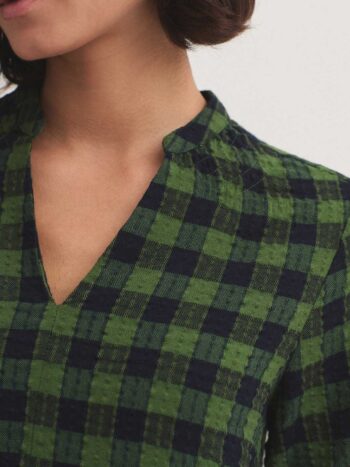 Vestido en mezcla de algodón sostenible con cuadros seersucker. Cuello mao abierto. Detalles de puntadas en delantero y espalda. Manga abullonada con puño elástico. Fitting evasé.