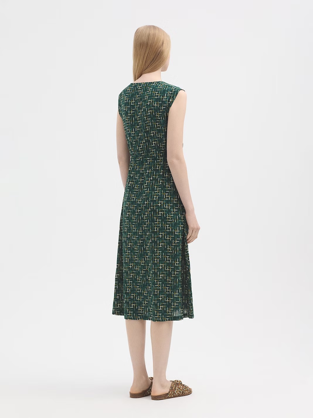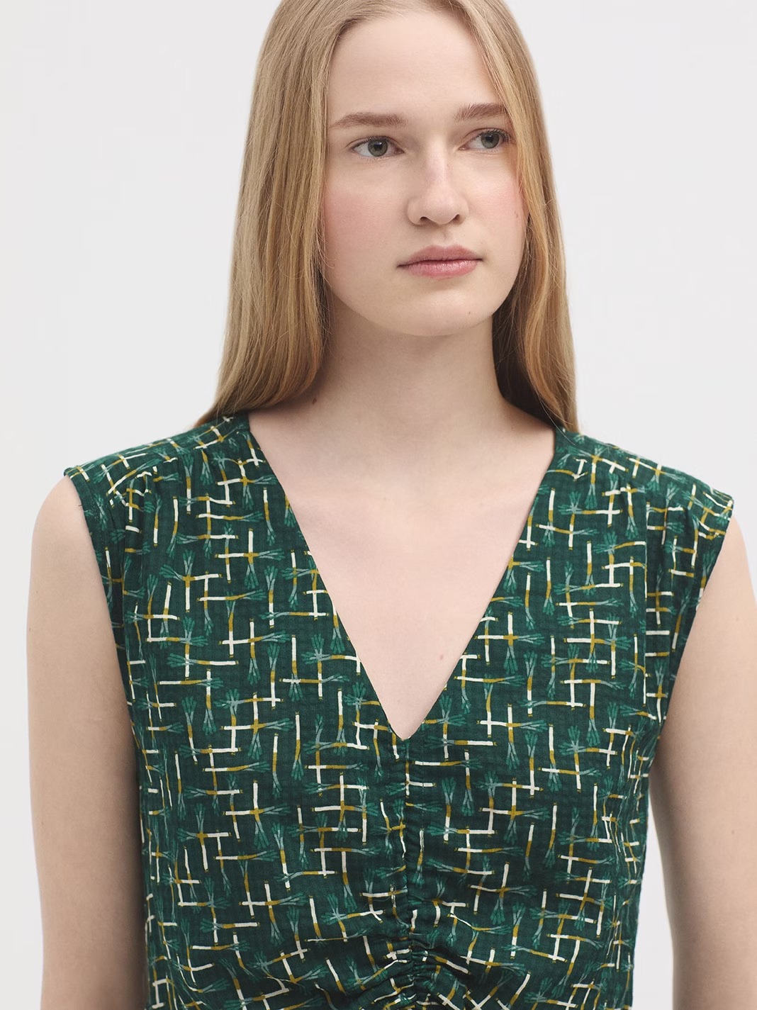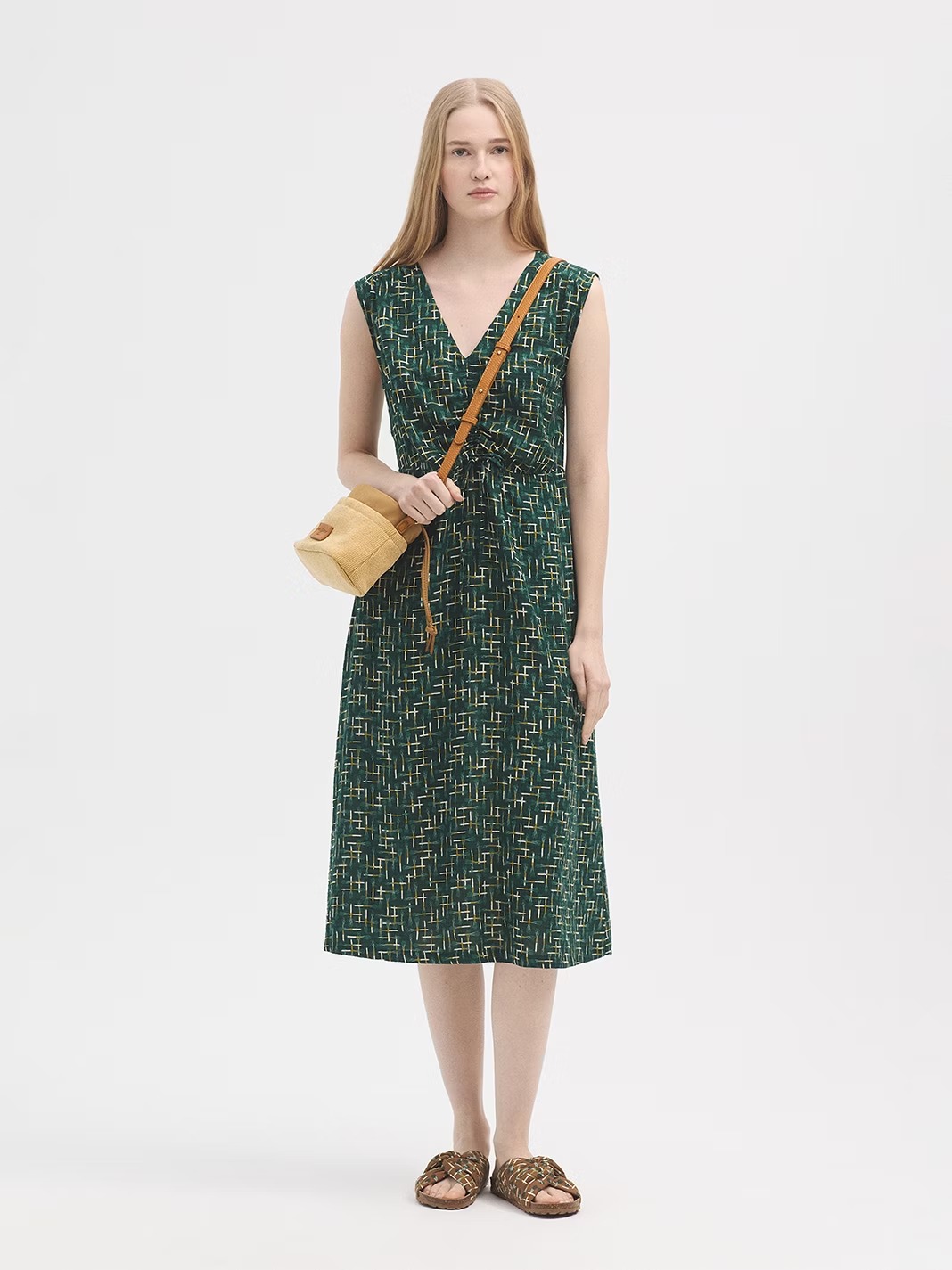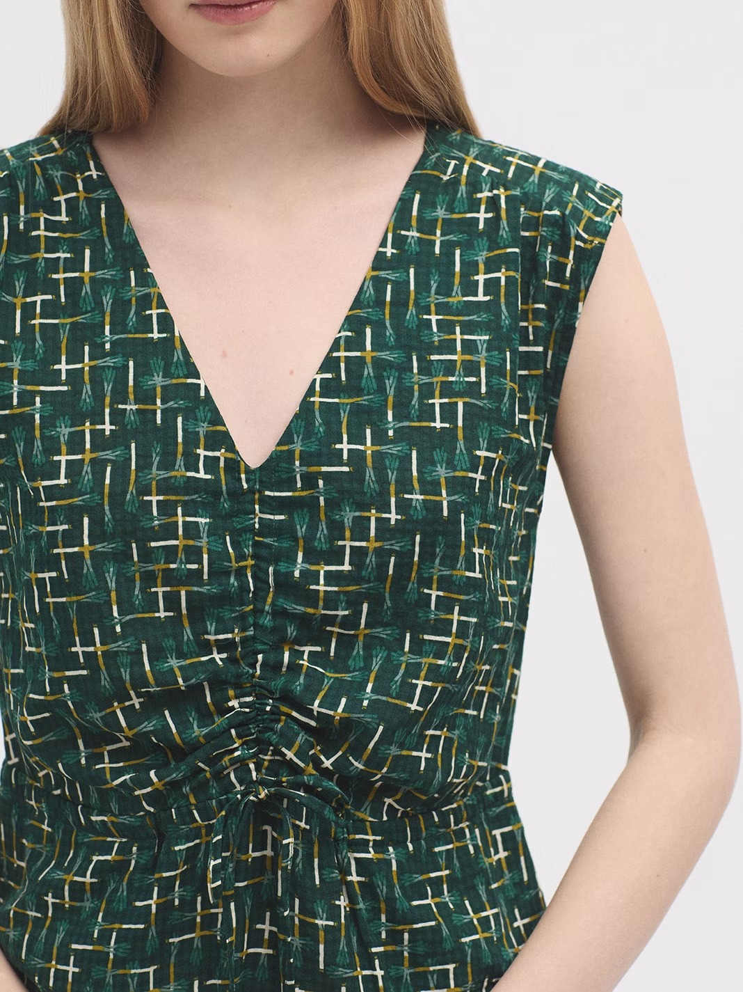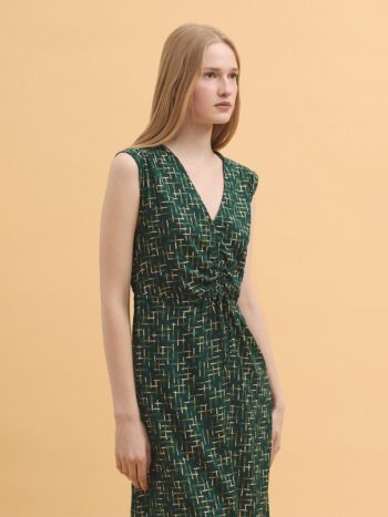 Vestido tejido cuadrillé estampado Leeks. Escote pico con frunce y tiras del mismo tejido. Cinturilla con elástico interior.