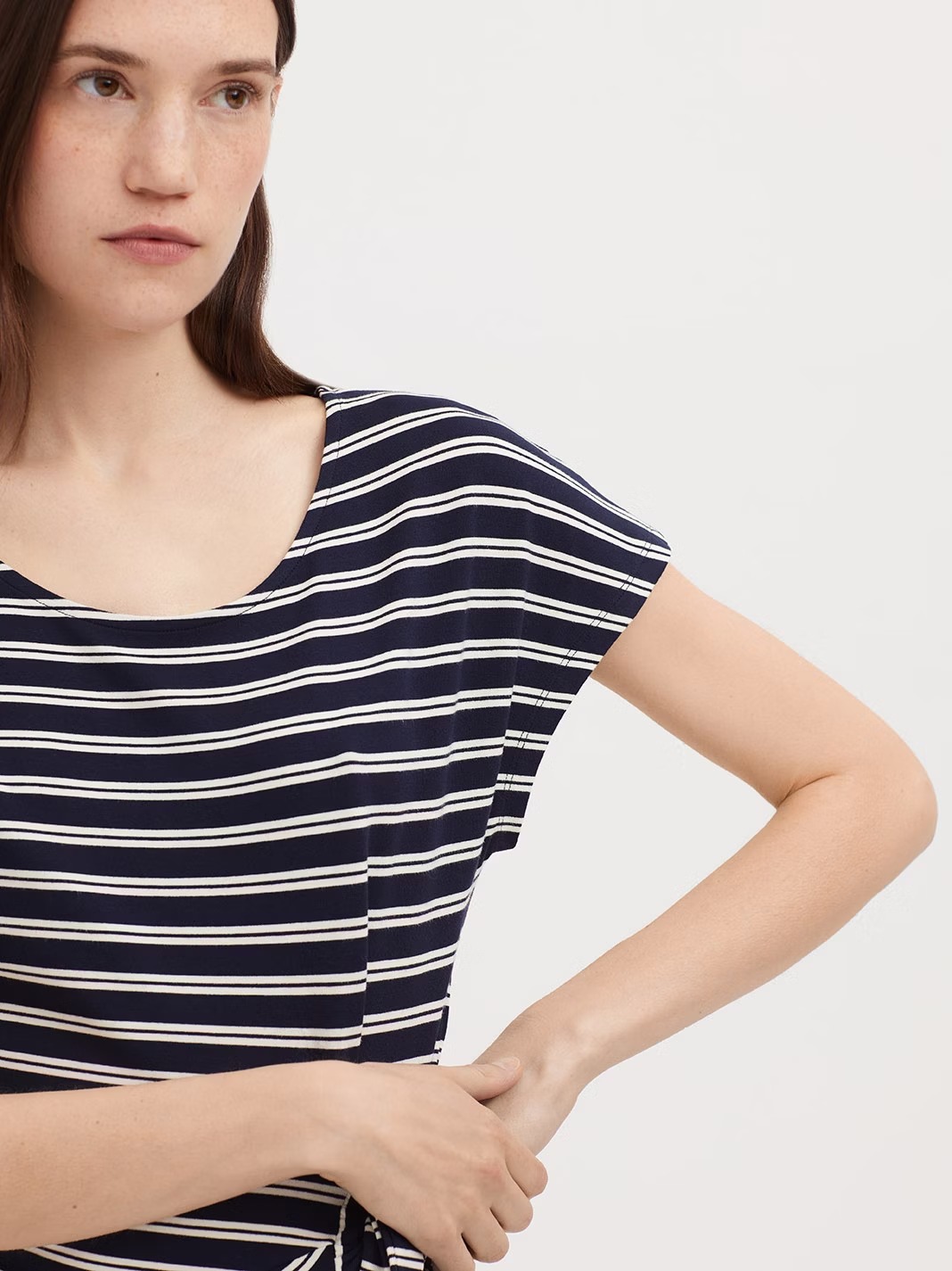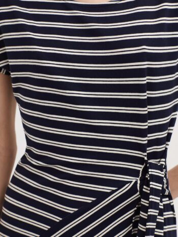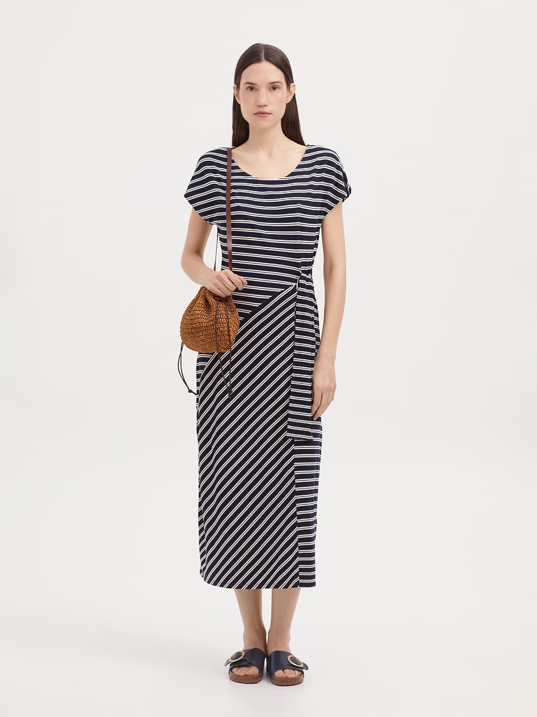 Vestido de rayas combinadas. Detalle de nudo en cintura. Escote redondo y manga corta caída. Made in Portugal.
