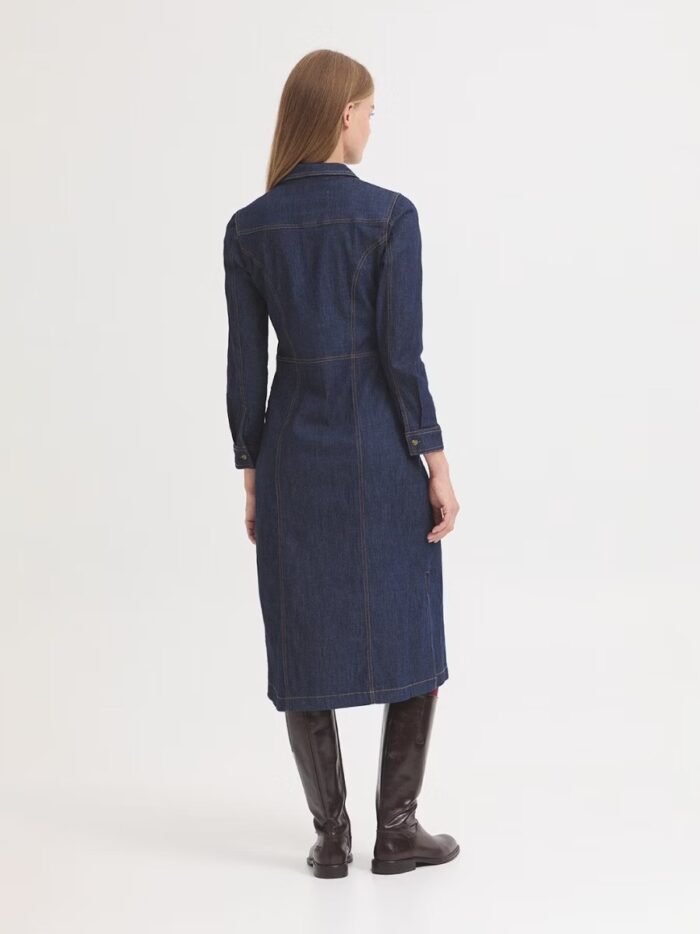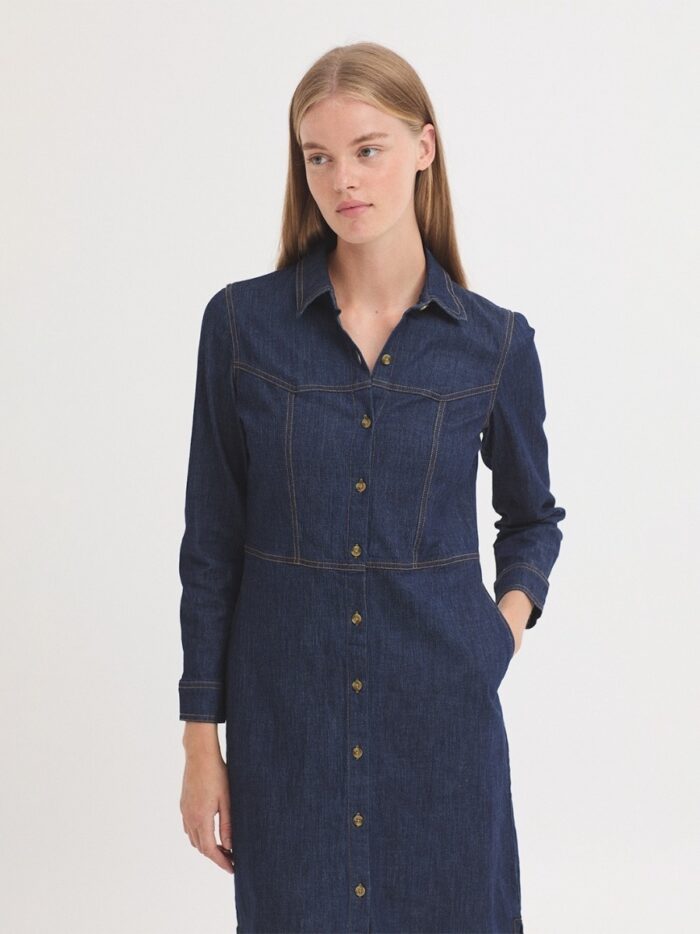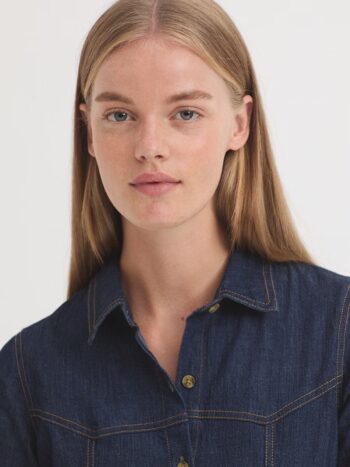 Vestido tejano azul de algodón sostenible, con cuello camisero y botonadura frontal. Canesú y costuras pespunteadas. Corte en la cintura y bolsillos. Parte trasera con canesú y costadillos. Aberturas laterales en el bajo.